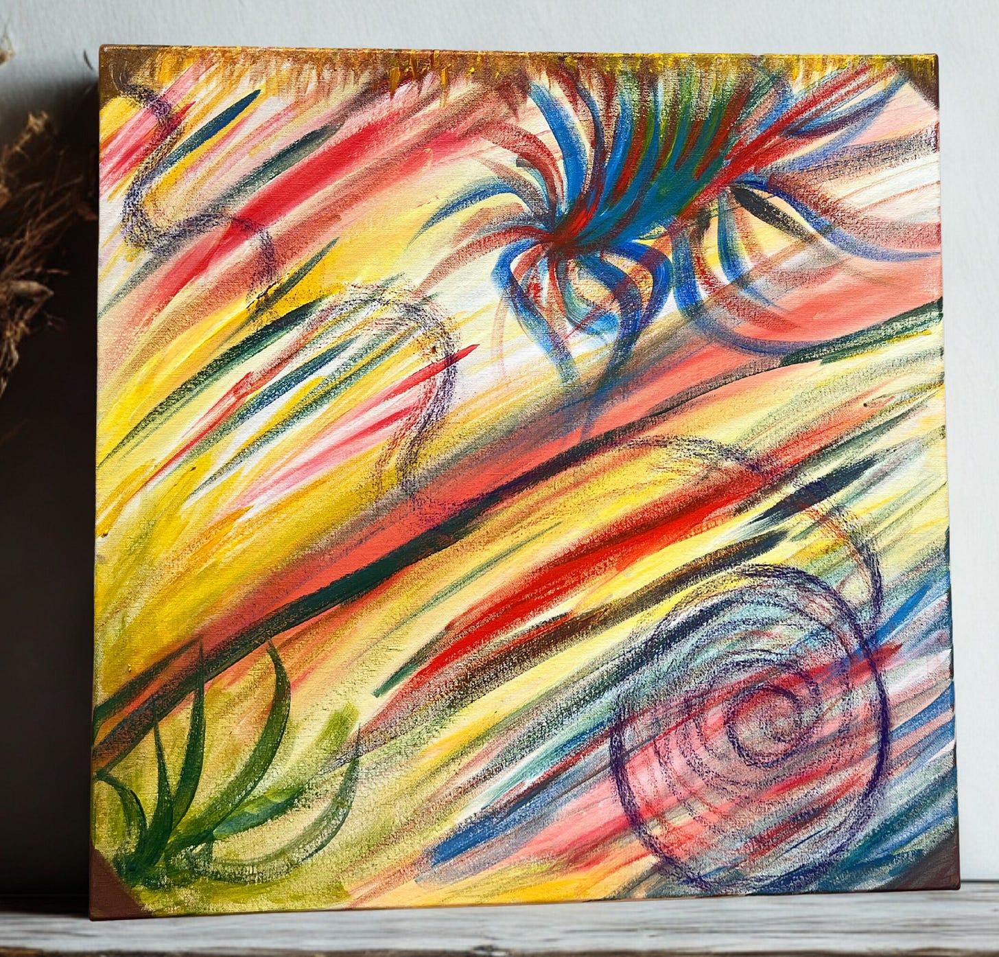 Don’t fear the rain as birds fly high, embrace this magic from the sky and the not knowing where or how the colors fade and fall. This fragmented palette of reds, greens, yellows and blues, glide and collide into the earth without sound or fury, just quiet delight.
