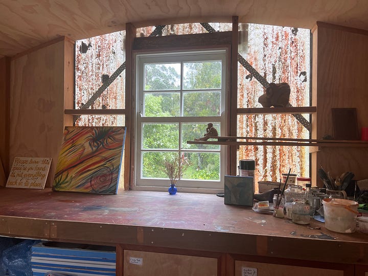 I painted the image above during a rainstorm in Aotearoa from a barn (photo below) with easels, paints, and large canvases scattered around. The rains began well before sunset and went through the night. While winds rattled windows and the water formed streams and puddles all around, no wifi or cell reception to be had, this shelter had light and warmth, a space to escape and create.